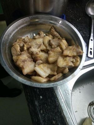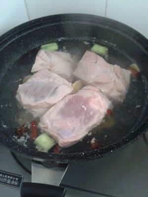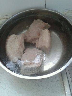 备肉。先用清水洗净肉,放入锅中,加清水,加姜块和葱段,加桂皮和八角,煮到七八成熟!