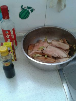 腌肉。肉切块,不要太厚,不好熟!切姜块和蒜苗,葱花,加料酒,酱油,十三香,盐,搅拌腌制一小时!