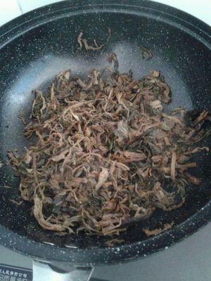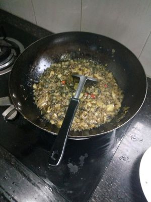 用刚才炸过肉的油,炒一下梅干菜。油的用量是平时炒菜的两倍。放刚才的料汁,一纸杯猪肉的汤。