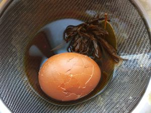 用漏勺将鸡蛋表皮小心敲裂,放入汤汁中继续煮五分钟后,关火浸泡几小时即可。