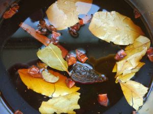将所有辅料加适量水。我用的是滇红茶。如果没有红茶,也可以用绿茶,比较而言红茶颜色更好,醇香而不像绿茶有少许涩味。
