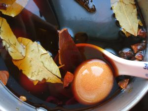 锅里加入肉皮(这个很关键)、适量的盐、酱油、桂皮、茶叶、大料等(有桂圆壳、核桃壳也可以加一点),再加入洗干净的鸡蛋,大火煮7分钟,把蛋敲碎,改小火煮15分钟,关火在汤里泡8小时以上入味!