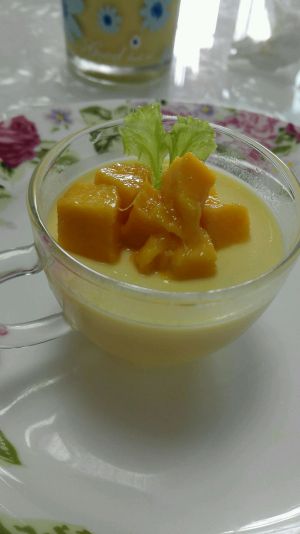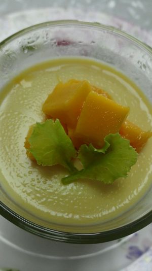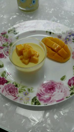 等牛奶液凉了加入淡奶油搅拌均匀,倒入容器中,放冰箱冷藏四小时以上,放少许芒果果然就可以享用啦!
