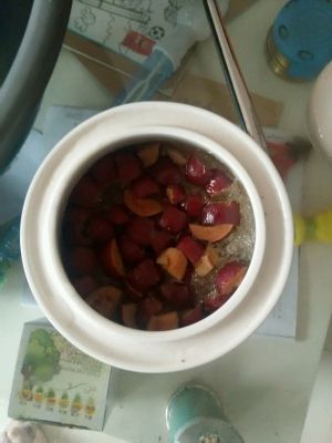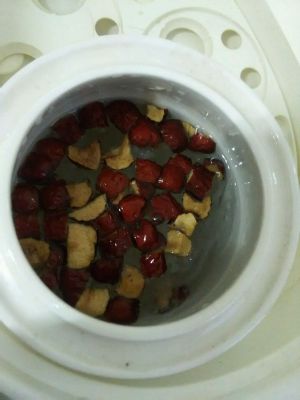 倒入纯净水,放入去核的红枣,我把它们切成小粒,最后加上冰糖