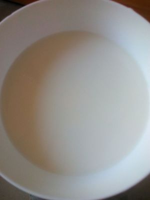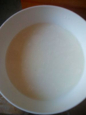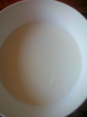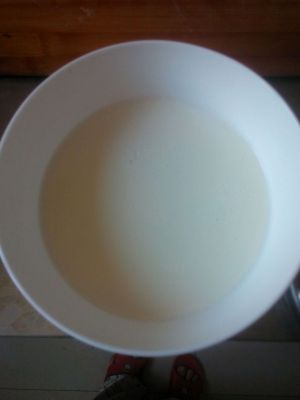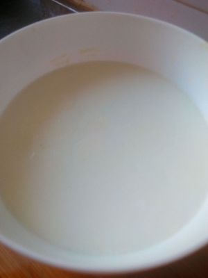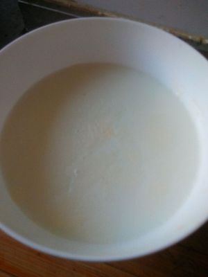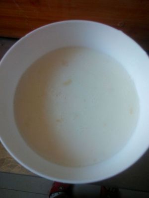 十分钟后,牛奶上面有薄薄的皮(如果太薄可以多蒸一会儿)。等凉了一些后,从皮的边缘倒出里面的牛奶(不要全倒出来,留一点儿在里面,否则一会儿倒不进去),和蛋白和好,再从边缘倒进去。这可是个功夫活呀!