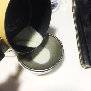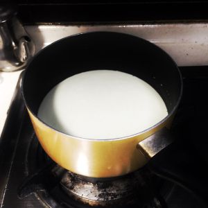 把蛋清与牛奶的混合液,沿小奶锅边缘小心倒入,奶皮浮起。