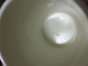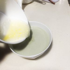将混合好的蛋清与牛奶搅拌均匀再倒回容器中,倒回容器中可稍稍静置等待奶皮调整至最佳位置