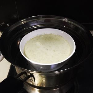烧一锅水,水沸后把奶液放入锅中,碗要盖上盖子。中火蒸10分钟,关火再焖5分钟。
