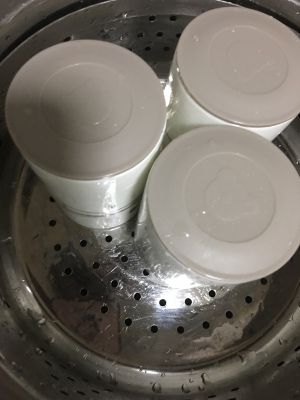 全脂奶入干净碗,待蒸锅的水烧开后,放入蒙好保鲜膜的碗蒸;计时10min;