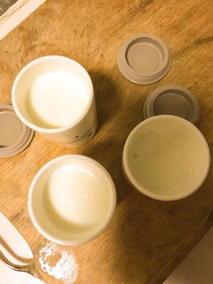 鲜奶蒸过10min后取出静置,等待奶皮结成(如果觉得太慢可以取一只大碗盛凉水隔碗冷却);