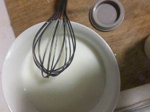 小心地沿奶锅边缘把三分之二的奶倒入蛋清,奶皮还留在小奶锅里,充分混合但不要打发。