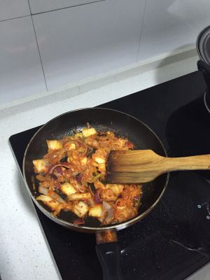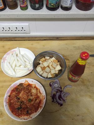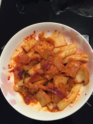锅里放油,七八成热下年糕,快速翻炒,不然年糕会粘锅底。我没有先把年糕热水焯过,直接炒的。而且要注意年糕不能炒太久,年糕里的气泡会炸开,溅的到处都是油。。小火快速翻炒,加韩国泡菜,其实我喜欢多加一些泡菜。味道很好。然后加一大勺韩国辣椒酱。