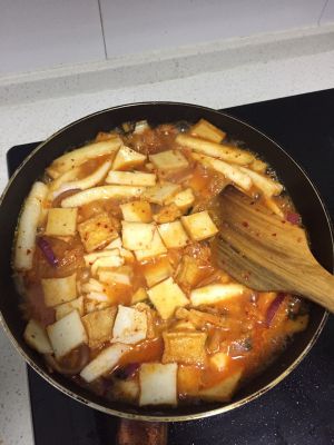 加入适量开水翻炒后,倒入年糕,不断搅拌,防止年糕粘锅,两分钟后倒入鱼豆腐片,再加入番茄酱,倒适量糖(因为我的辣白菜较酸,依据个人口味放)。