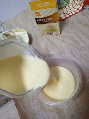 蛋液上锅,还是隔水加热,怕煮成蛋花粥所以隔水,然后把奶液加入蛋液中,加热至液体变浓稠便可以起锅了,放入事先备好的芒果泥儿。。OK放入冰箱。。期待中