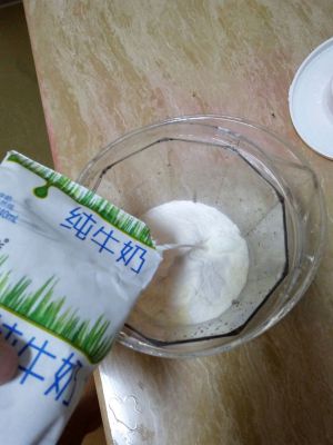 将70ml纯牛奶和10g糖粉与芒果块混合,用料理棒打成类似奶昔状。