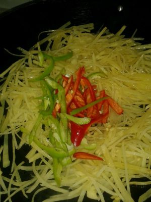 放入2个干红辣椒, 再把沥干水的土豆丝倒进去, 动作要快, 要不干辣椒会 变黑.