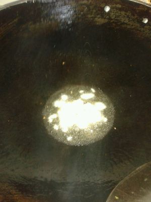 锅里放两大勺油烧热. 放一把花椒炸至表面开始变黑, 把花椒捞出.