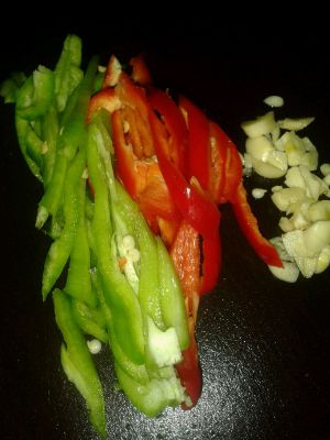 青红辣椒去蒂洗净,切丝;蒜切丁。