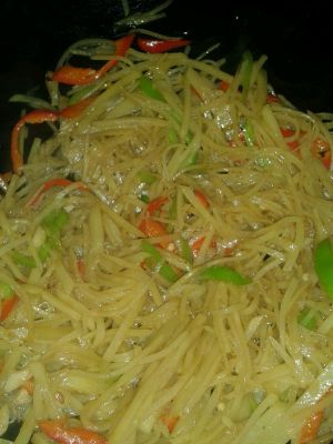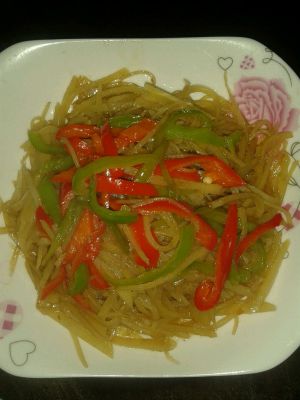 先后放入土豆丝、青红辣椒丝翻炒片刻。