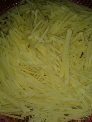 土豆去皮切丝,放在冷水里浸泡一下,捞出滤干水份。