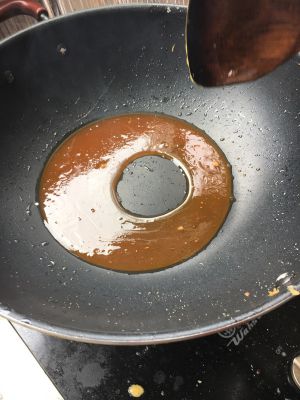 另起锅,放很少的油,放入白糖,小火炒至溶化变色,这步不能着急,慢慢的炒糖色(图上的这种焦糖色为炒好的样子)千万不要炒焦了!