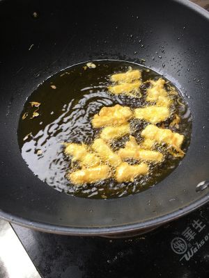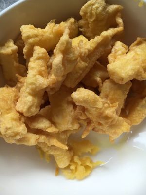 山药切成条状,盆里打鸡蛋,放少许面粉拌匀!热锅凉油,待油六、七成热的时候炸裹好的山药!