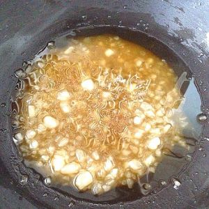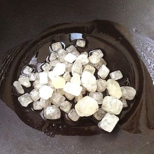 锅里放入少量油,放入冰糖,搅拌,至糖稀变成金黄色。