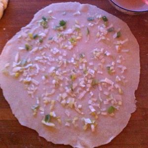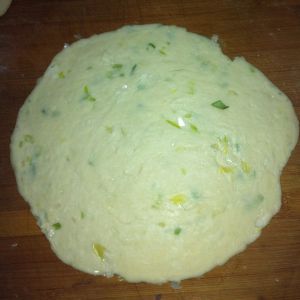 醒好的面揪成合适的剂子,擀开,越薄越好,刷上植物油,撒上盐,放上切好的葱花。卷起来,从一头开始再盘成一个圆饼。