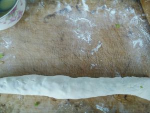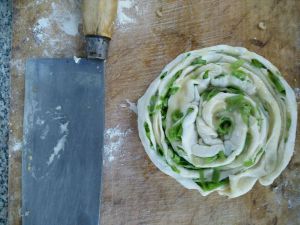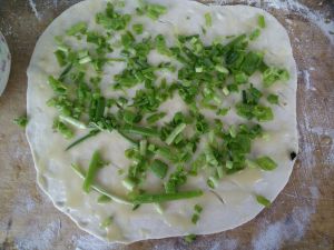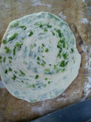 面醒好后切成小团,将小团用擀面杖擀成薄,长条形,涂上葱油,洒上葱花,卷成长条