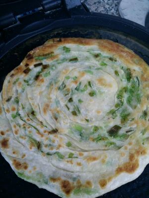 把面粉用稍微烫手的温度和好,然后用东西罩住放置三十分钟,准备一个空碗放两勺面粉一勺盐。锅里倒油放入切好的小葱(炸葱油,可以放两瓣花椒和大料),炸好走后把大葱和花椒等东西过滤出去,把油浇在事先准备好的面粉上,调成油酥!把醒好的面分成均等的几份,拿出一份赶成面皮把油酥均匀的抹在面皮上在把葱花撒在上面!