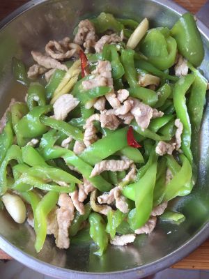 肉放盐料酒腌制,锅里放少许油,小火扁炒五花肉至金黄盛出,再把青椒放进去炒变色后放一点盐调味,倒入肉一起炒,放味精起锅