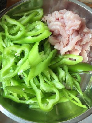 青椒切丝,肉也切丝,肉丝放点生粉腌制10分钟左右,蒜切末。