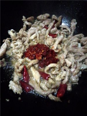 加入一大勺豆瓣酱,翻炒均匀,使肉片均匀上色,然后加如少许料酒han