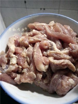 准备好材料。把猪肉切丁放上适量的盐、料酒、澄粉抓均匀腌制10分钟,青椒切成丝备用