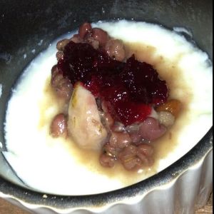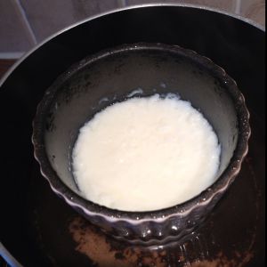 把搅匀的蛋奶液倒回存有奶皮的碗里,放到锅里隔水炖或蒸10分钟。