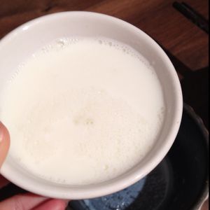 把牛奶轻轻再倒回碗里,奶皮会浮起来。再一次加热到微泡,晾凉后还会有一层奶皮。