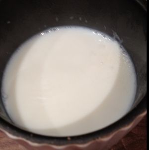时间到了,把牛奶晾凉。很快就会出奶皮,在旁边划一个小口,轻轻将牛奶倒入蛋清的腕里。打匀.