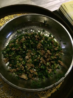 把准备好的葱切成小段,放少许花椒油,肉末放进锅里爆香炒熟,炒好的肉末混入葱花中!