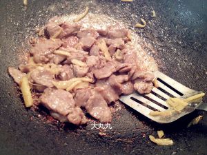 锅中倒入油,放姜丝炒后倒入羊肉爆炒,肉变色后加入汁料。