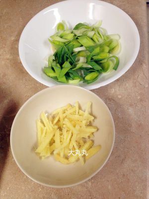 大葱切斜段,姜切丝。