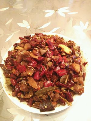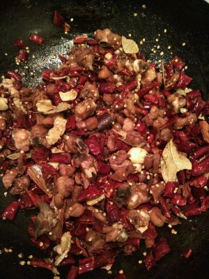 炸完鸡块锅里留点底油,一点点就可以,下入麻椒,辣椒,然后葱姜蒜,火太急了,没拍图片,