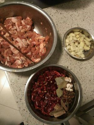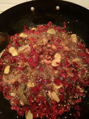倒入香料炒两分钟左右在倒入辣椒花椒