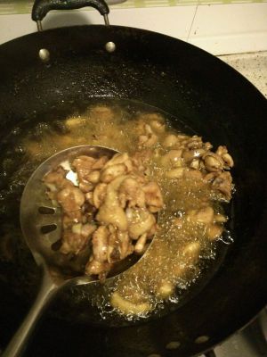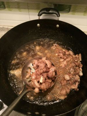 腌好以后,加入少量淀粉,热油,油温要高,下鸡块