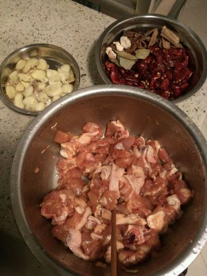 将切好的鸡块,加入十三香,盐和味精,凉拌均匀,研制就可以了,要是不急就多腌一会