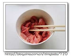 将猪肉切片儿,放淀粉、料酒少许、盐少许腌制。
