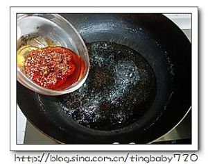 炒锅放油,放花椒炸成发黑色,将花椒挑出,放入葱姜蒜,放入郫县豆瓣酱,炒出红油,添水烧开