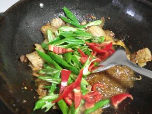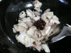 蒜姜辣椒酱炒香,放入五花肉翻炒至略黄