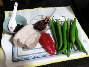 熟五花肉一块,黑豆豉半勺,豆瓣酱1勺,青椒,红椒一个