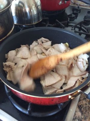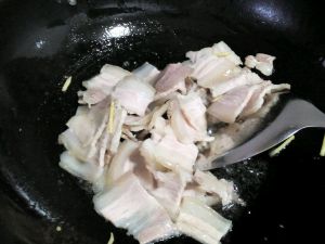 油热以后下五花肉翻炒至边上变黄,微微卷起。