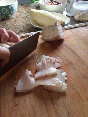 首先买回来的新鲜五花肉要在开水里煮熟,开水里倒两勺料酒,一个八角,几片姜,一个桂皮去腥。煮好后拿出来晾凉。因为这是我上次处理好的五花肉,所以今天就没有详细细节图。下次单开一贴补上。